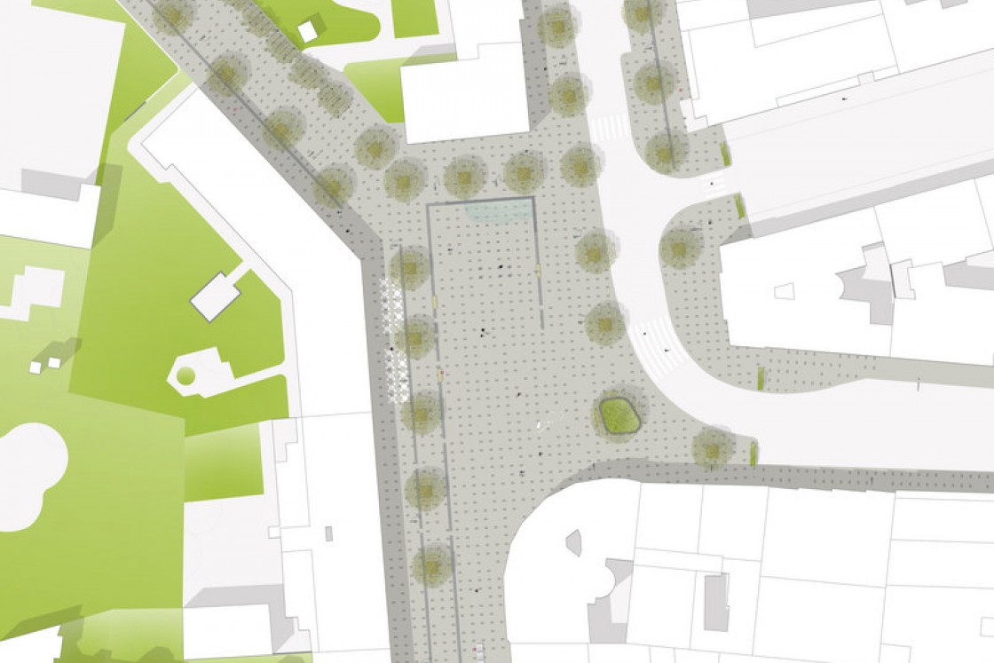 Um die sanierte Lerchenfelder-Kirche entstand ein neuer großzügiger Stadtplatz. Seine einheitliche Pflasterfläche bietet optimalen Raum für unterschiedliche Nutzungen. Ein Bauernmarkt findet ebenso Platz wie ein großer, bespielbarer Brunnen. Der neue Platz bietet räumlich und inhaltlich eine größtmögliche Offenkeit, trotzdem überwiegt das Grün.