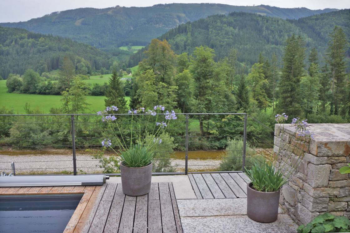 Ein schmales Grundstück auf halber Höhe über dem Ybbstal, Kaum genug Platz für das Haus. Der Ausblick ins Tal hinein allgegenwärtig. Der Garten ist über zwei Etagen extrem mit dem Haus verwoben, Die Mauern des Hauses und die vielen Stützmauern bieten Schutz vor dem rauheren Klima. So kann sich eine üppige Staudenpracht entfalten.