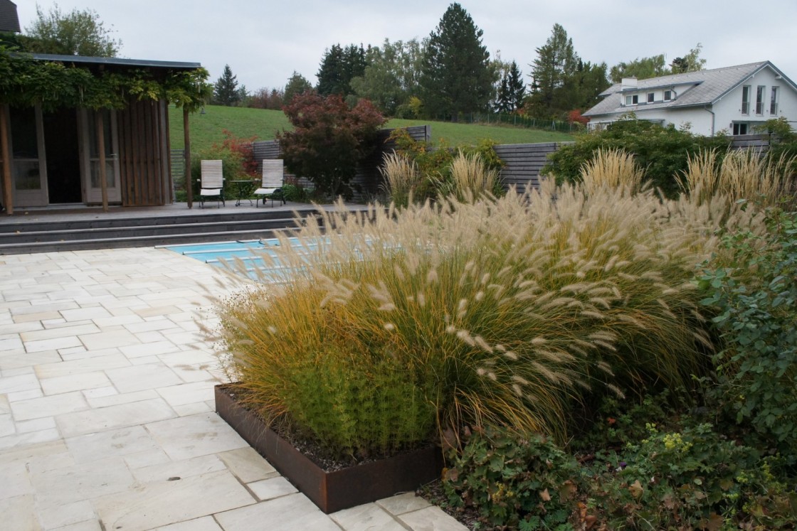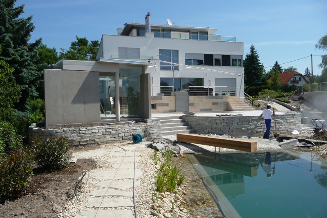 Die großzügige Gestaltung des Gartens erfolgte im Zuge des Um- und Ausbaus einer bestehenden Villa. Zusätzlich mussten neue Baulichkeiten in die Planung integiert werden. Ein umfassendes Raumkonzept für die Terrassierung des Geländes und die Anpassung des bestehenden Schwimmteiches waren Grundlage der Planung. Der waldartige Gehölzbestand wurde teilweise durch neue raumbildende Baumgruppen ersetzt.