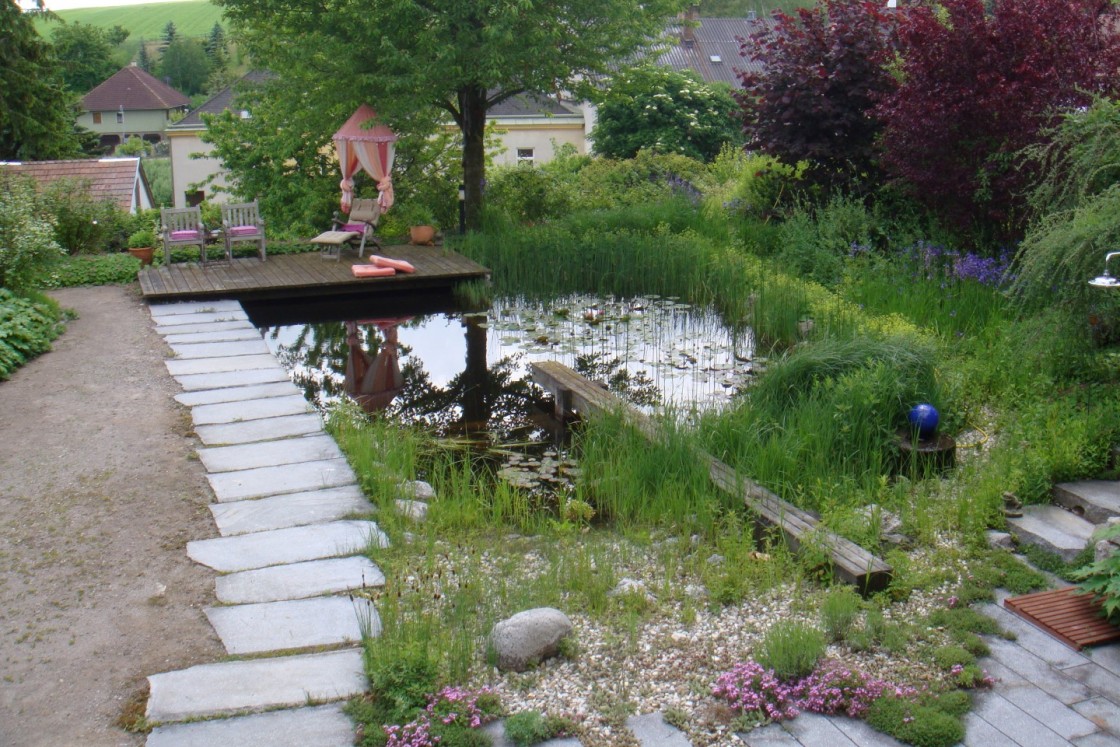 Auch Gartenberatungen und einfache Konzeptskizzen können in der Hand engagierter Eigentümer mit Unterstützung des Gartenarchitekten zu ansehnlichen Ergebnissen führen. Der große Villengarten wurde in Eigenleistung terrassiert, auch die Stützmauern und das Wasserbecken entstanden auf diese Art.