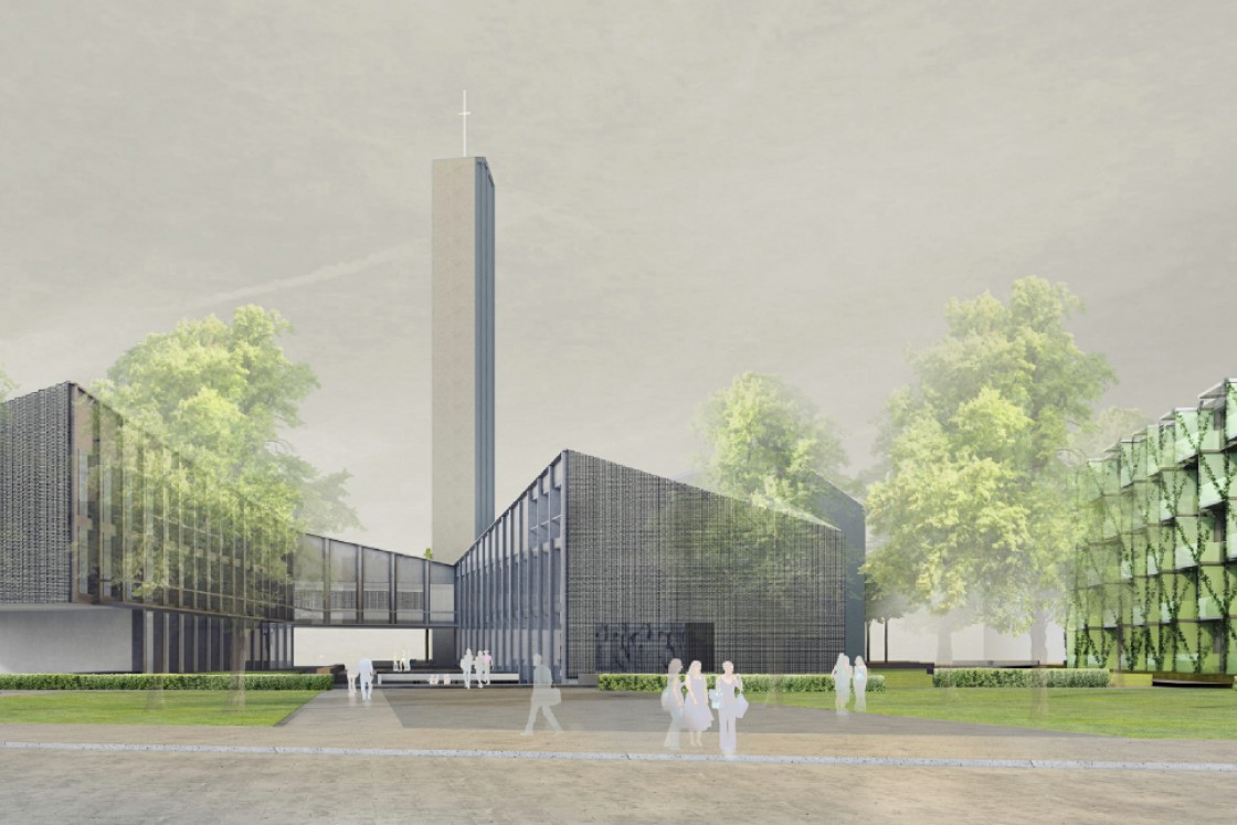 Wettbewerbsbeitrag zur Neugestaltung einer Wohnhausanlage und des Pfarrheimes unter Berücksichtigung der angrenzenden Platzstuationen bzw. Parkanlage.