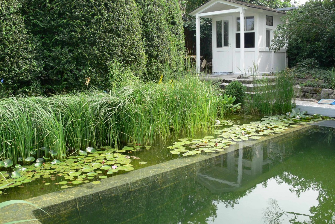 Dies ist der Garten eines Kunstsammlers. Die Gartenarchitektur schafft die grüne Verbindung zwischen den Skulpturen. Doch der Garten ist auch das grüne Wohnzimmer für die Familie. Und so hat der bereits vorhandene Schwimmteich eine neue Kante und ein elegantes Holzdeck bekommen. Die Terrasse am Haus wurde über kunstvoll gepflasterte breite Stufen mit dem Garten verbunden.