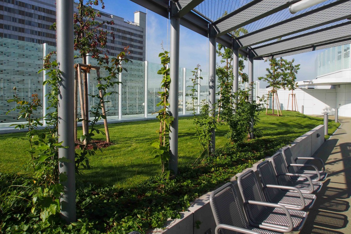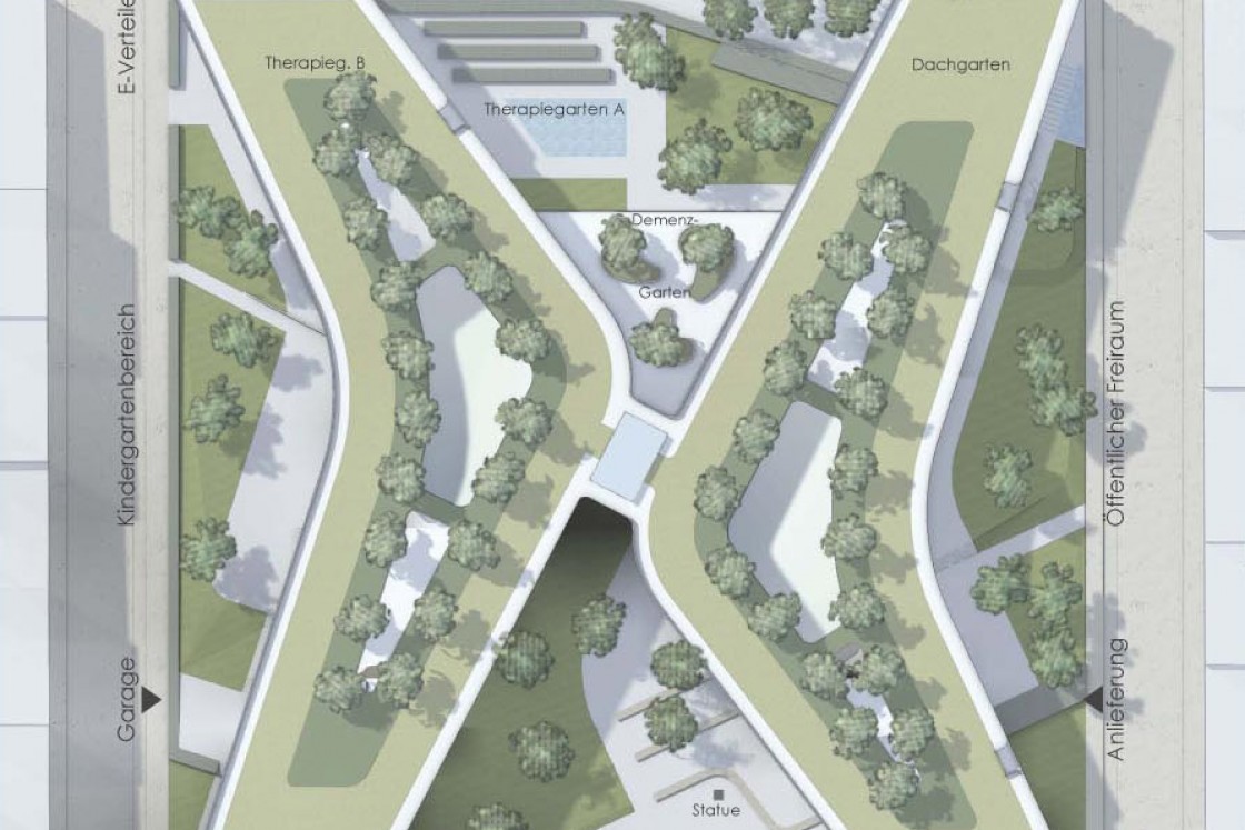 Am Areal der aufgelassenen Schwesternschule wird ein Neurologisches Krankenhaus gebaut. Im Erdgeschoß begleiten schmale Hochbeete den Gehsteig und formen einen lebendigen Rahmen auf Augenhöhe. An der Nordseite entsteht um die Bestandsbäume ein kleiner, öffentlich zugänglicher Gartenraum, welcher auch ein Bindeglied zum Cafe im Erdgeschoß bildet.